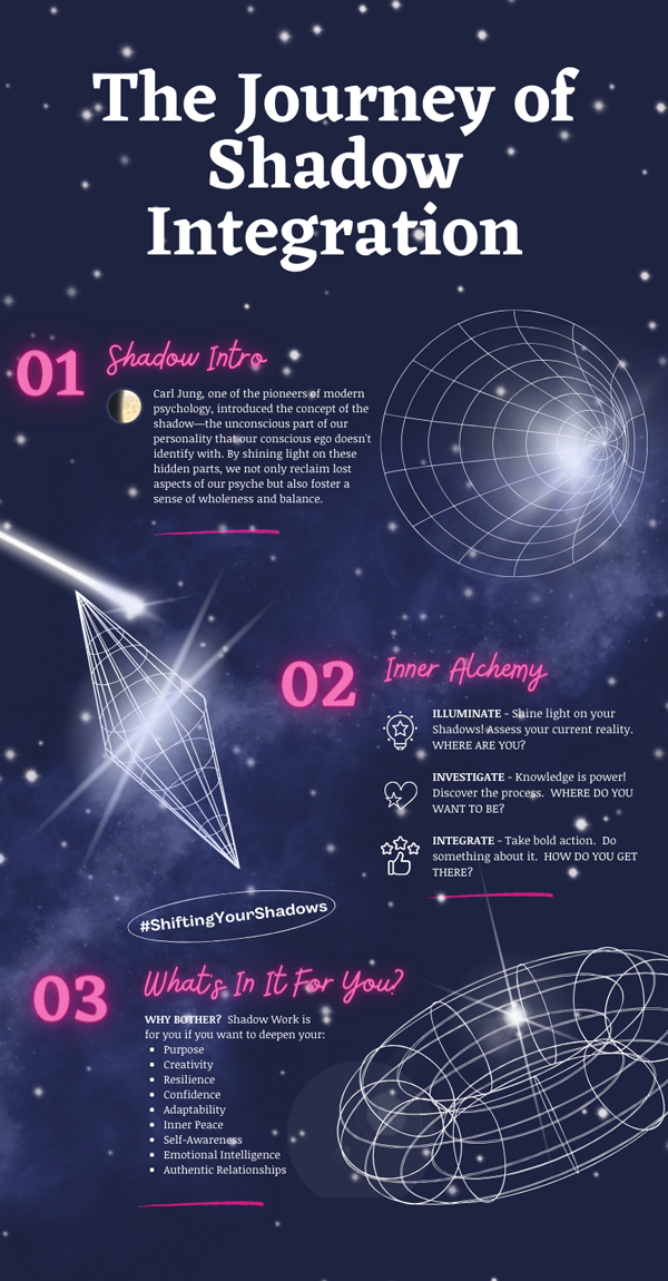 Take a cosmic journey within. Remember the "3 I's": ILLUMINATE your shadows, INVESTIGATE them, and INTEGRATE them into your greatest gifts. Share your experiences with our community of πSTELLASπ and delve deeper into shadow work with the resources below.